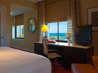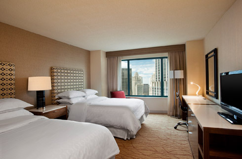 Sheraton Chicago Hotel & Towers (NAR) Enjoy your room's view of the Chicago River, Lake Michigan or the city skyline, in-room wireless Internet, a fitness center, indoor heated pool, sun deck and dry sauna. Dining options include: Shula’s Steak House, LB Bistro & Pâtisserie, Chi Bar and more. This hotel is located in the Streeterville area, or 2.5 miles from the McCormick Place Convention Center.